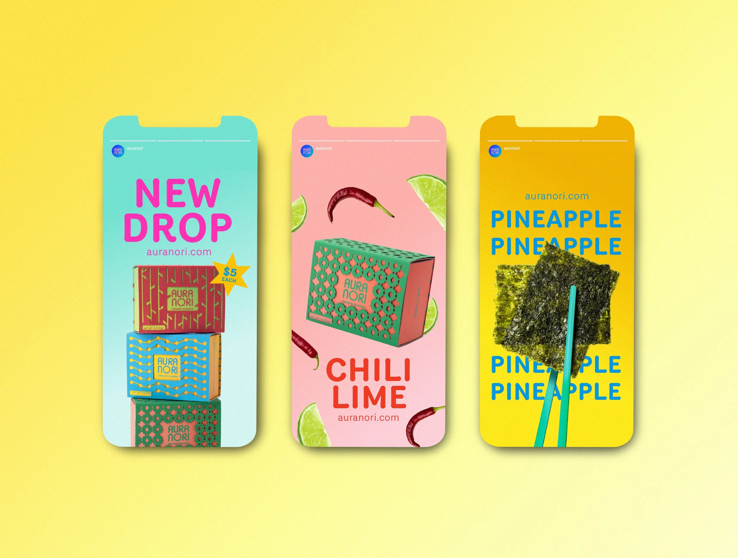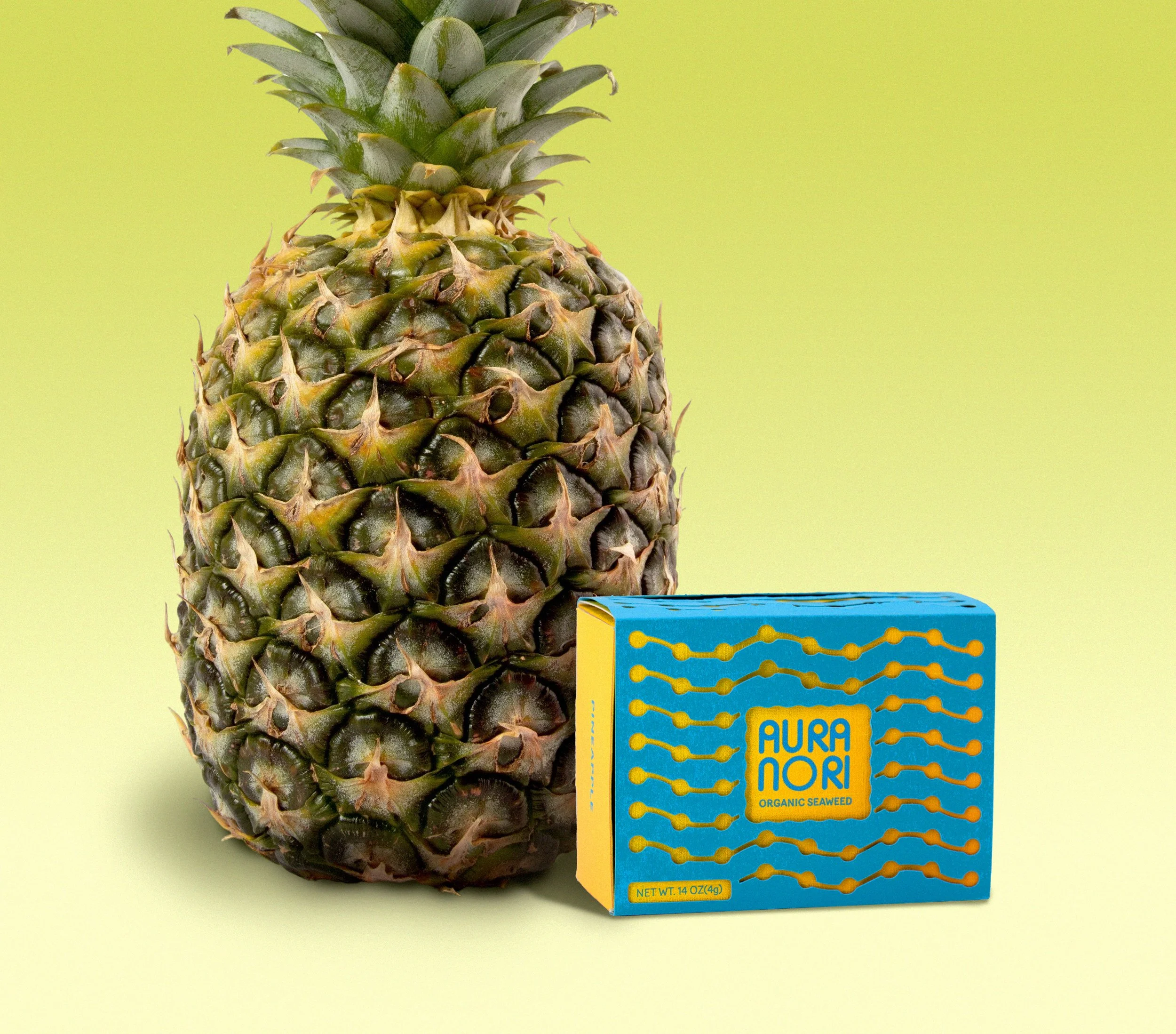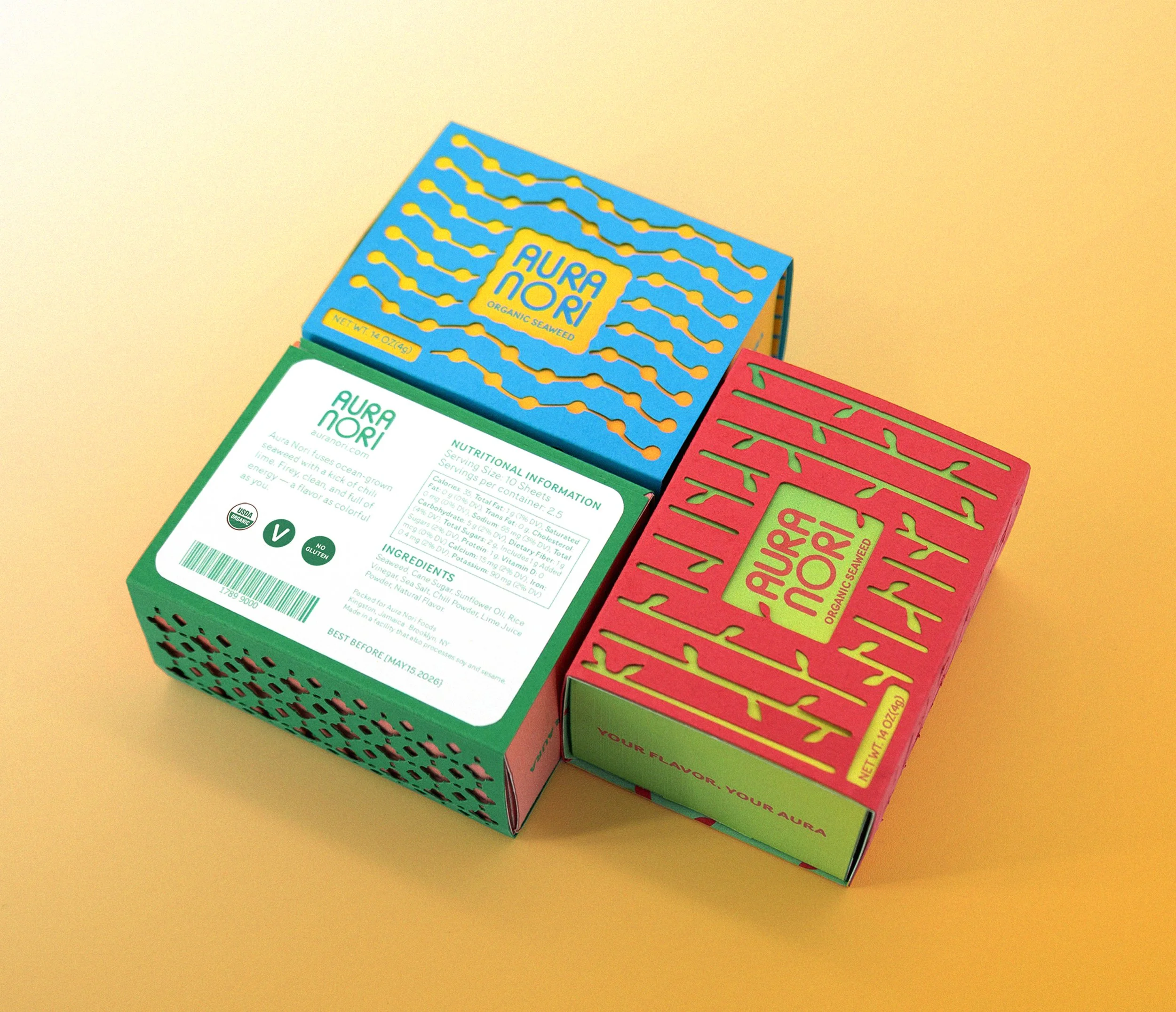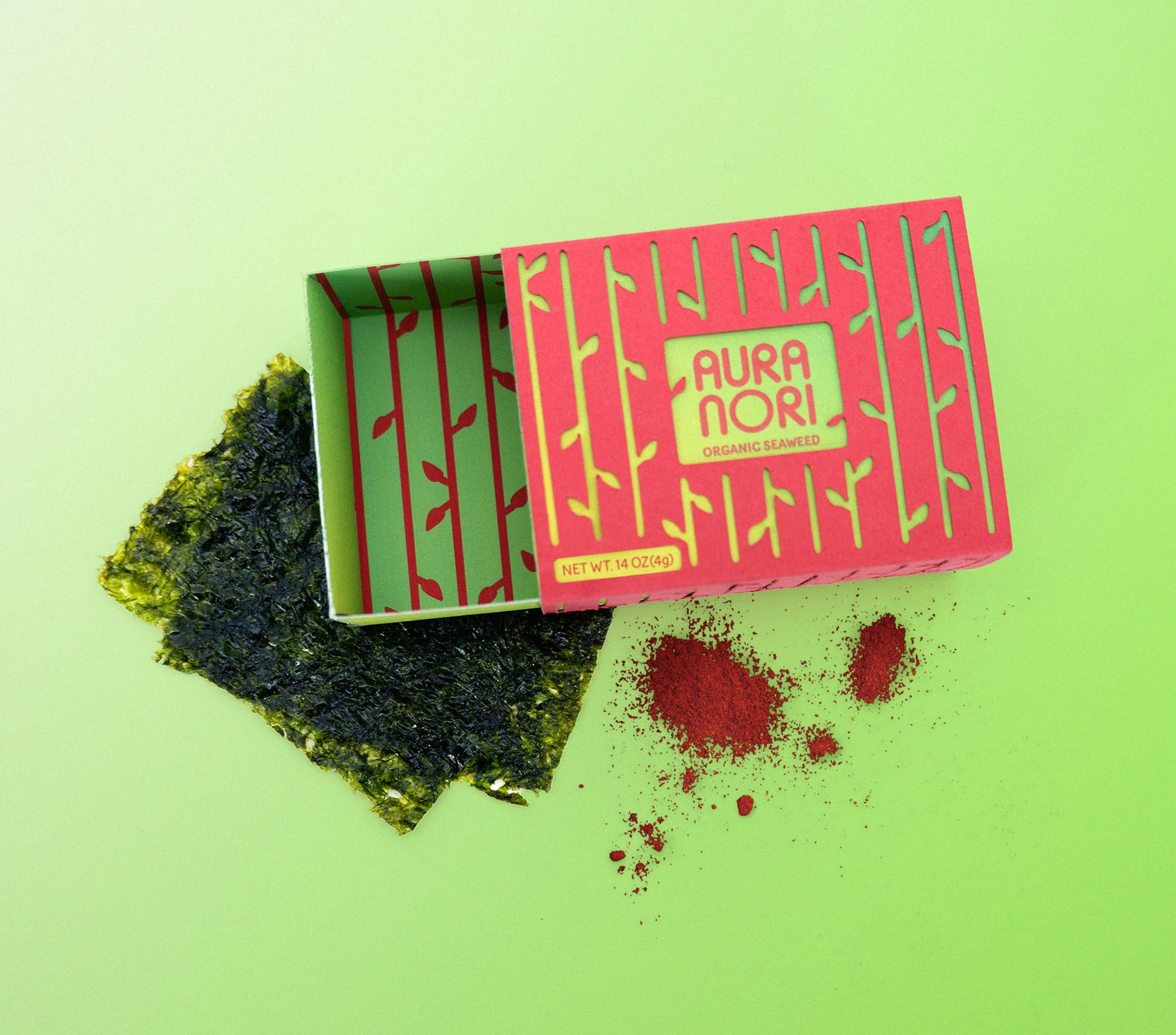 Aura Nori is a Japanese and West Coast–inspired seaweed brand that mixes gourmet flavor with a playful, bold feel.