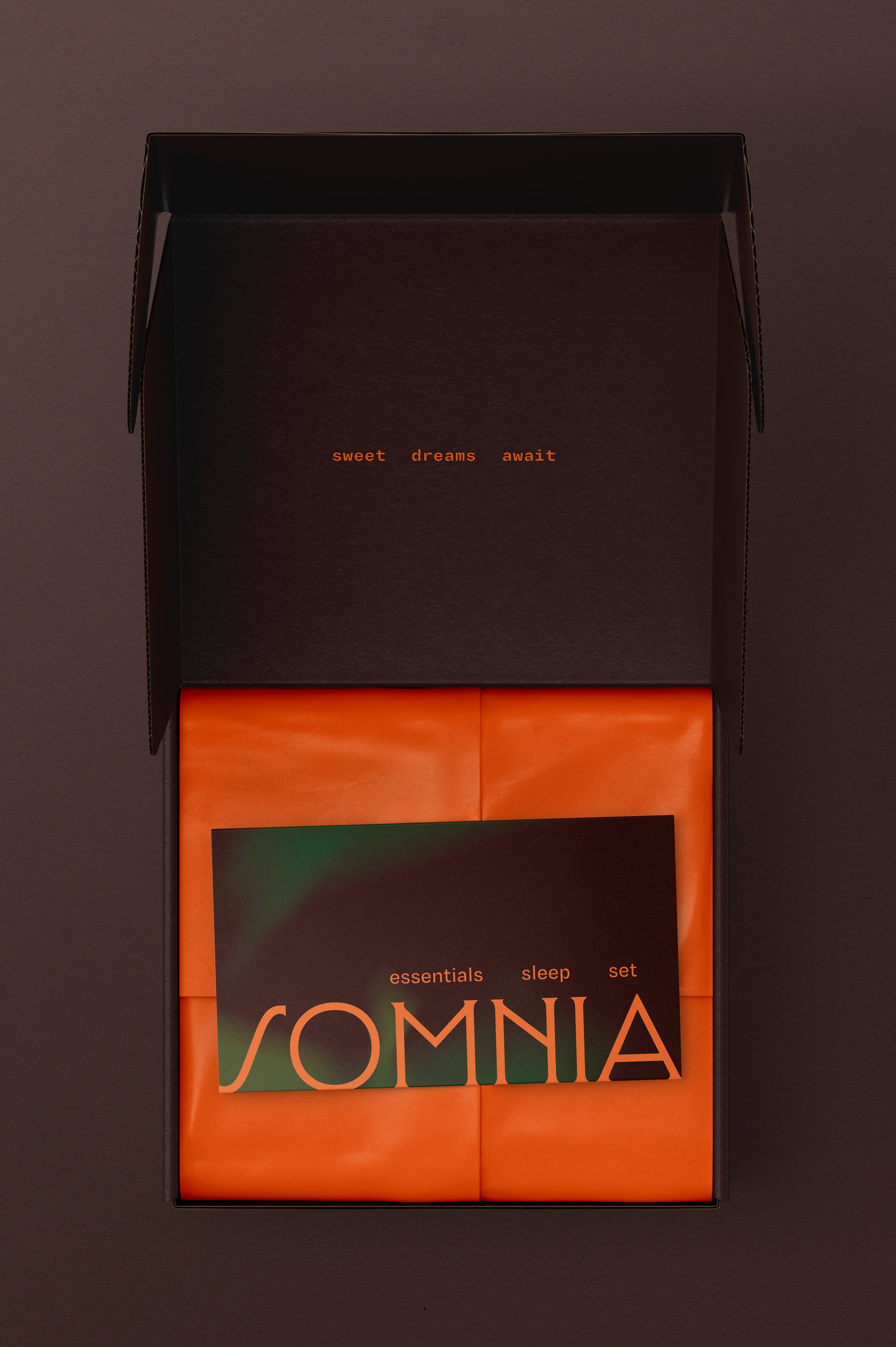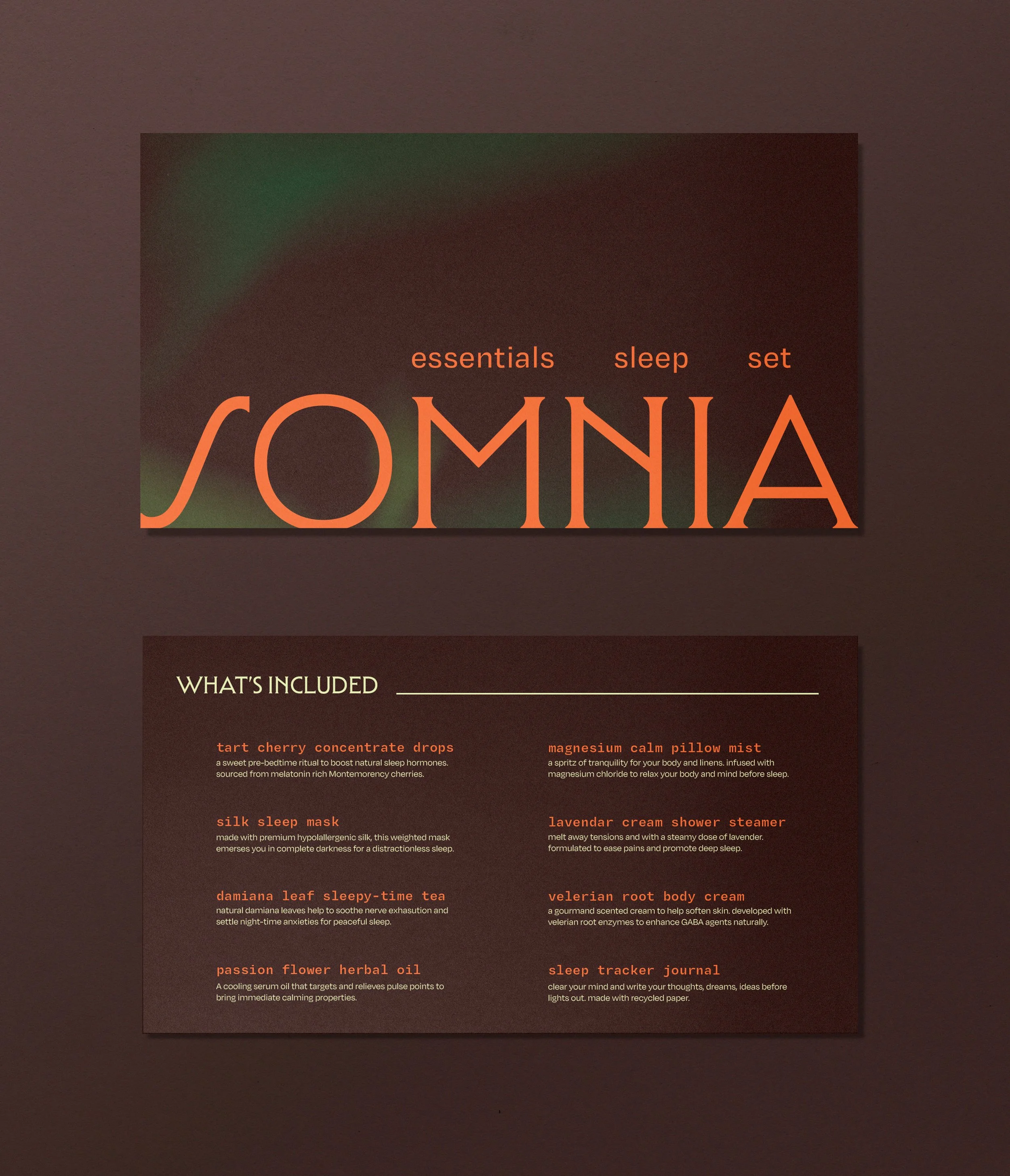 The design emphasizes a luxurious, fully packaged experience, with soft, dreamlike visuals across rich, earth tone backgrounds. The warm, grounded hues create a sense of comfort, inviting rest while framing sleep as both an intentional and soothing ritual.